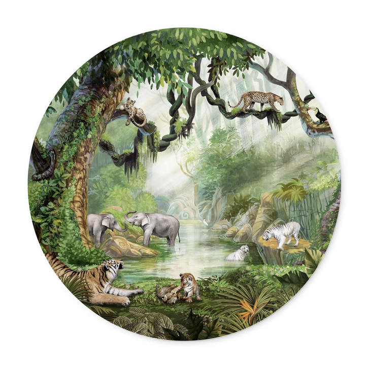 Willkommen im Dschungel: Mit dem Wandbild der liebevollen Illustration von Kikki Belle verwandeln Sie das Kinderzimmer in einen wilden, grünen Dschungel. Hier lassen sich zahlreiche Wildkatzen beobachten: eine Tigerfamilie, weisse Tiger und Leoparden auf einem Baum. An der Wasserstelle befinden sich auch ein Elefantenpärchen und ein Tukan. Das grüne Naturmotiv belebt die Wand und bringt kleine und grosse Dschungel-Liebhaber zum Träumen.