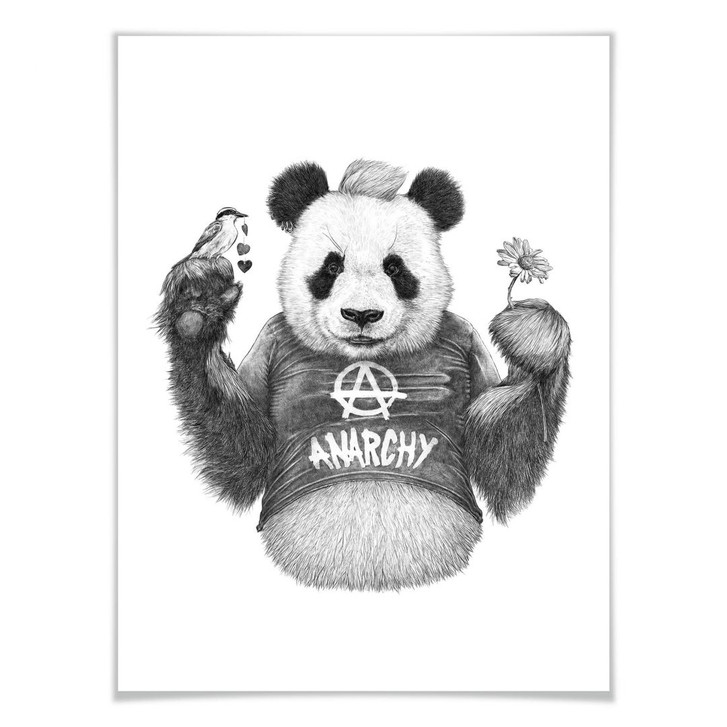 Dieser Panda zeigt seine punkige Seite. Mit einem schrägen Irokesenschnitt und einem „Anarchy“-T-Shirt schaut er dich an und lächelt. Aber in einer Pfote hält er eine Blume und auf seiner anderen Pfote sitzt ein Vogel mit einem kleinen Band im Schnabel, an dem Herzen hängen.