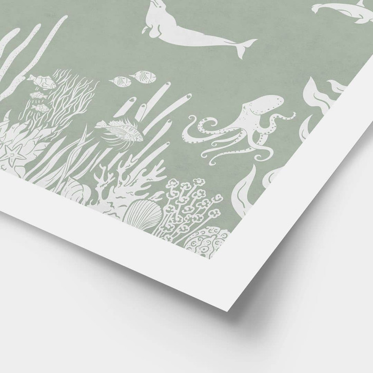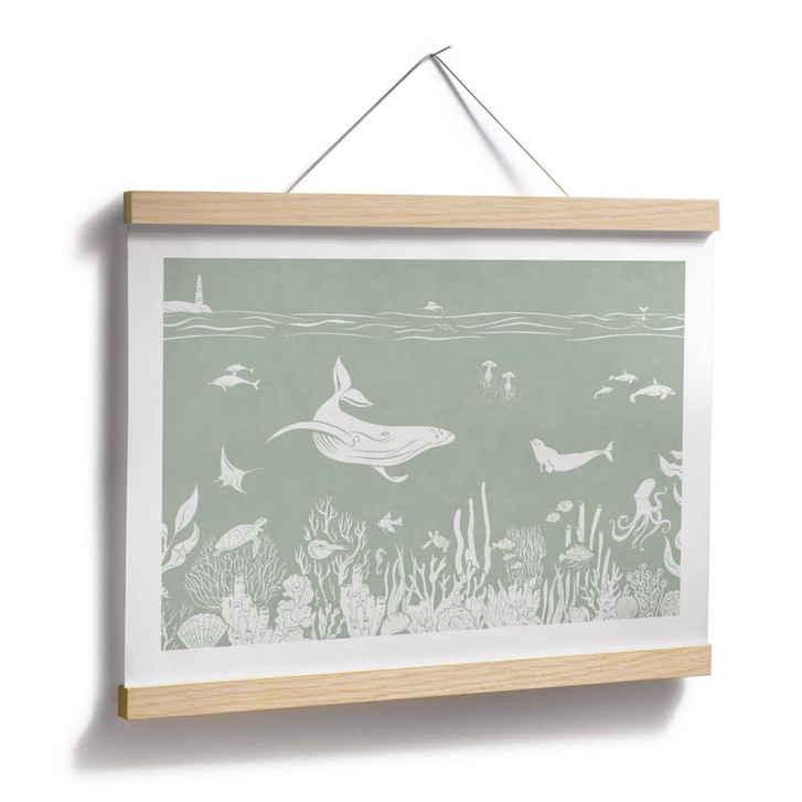 Dieses kunstvolle Poster bringt die beruhigende Schönheit der Meereswelt direkt in dein Zuhause. Die sanften Grüntöne und zarten weissen Illustrationen schaffen eine harmonische, entspannte Atmosphäre, die sich perfekt für jede Wohnumgebung eignet. Der hochwertige Rahmen setzt das Motiv elegant in Szene und macht es zu einem stilvollen Blickfang.