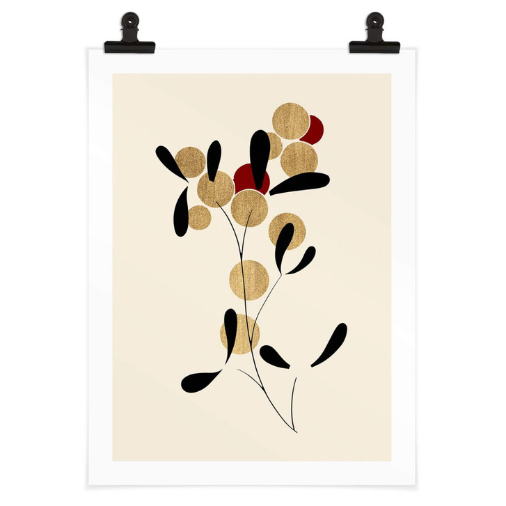 Entdecke den minimalistischen Wohntrend: Minimalismus. Einfache Bilder verwenden Formen und Farben, um Klarheit und Leichtigkeit zu schaffen. Auf überflüssige Elemente wird bewusst verzichtet und der Fokus liegt auf dem Wesentlichen, was dem Motiv mehr Ausdruck verleiht. Dieser Kunstdruck konzentriert sich auf die reine Schönheit eines Beerenzweigs. Die goldenen Elemente verleihen dem Ganzen einen Hauch von Eleganz. Dank seiner Schlichtheit lässt sich das Bild in verschiedene Einrichtungsstile wie Boho, Vintage und Skandinavisch integrieren.