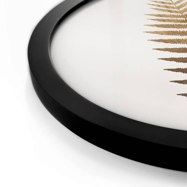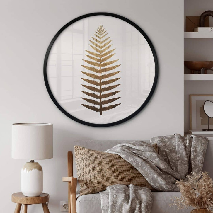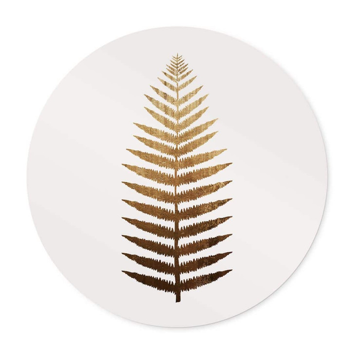 Möchtest du dein Zuhause optisch aufwerten? Dieses runde Wandbild setzt sofort neue Highlights in deinem Raum. Das kunstvolle Motiv „Golden Fern“ schmückt jedes Zuhause. Das schlichte Design in Gold und Weiss wirkt stilvoll und elegant. Die detaillierte und geheimnisvolle Zeichnung des facettenreichen Farns von der Künstlerin Kubistika ist keineswegs schmucklos. Vielmehr besticht die Pflanze durch ihre klare und zarte Struktur. Die Illustration wirkt beruhigend auf den Betrachter und fokussiert seine Gedanken.