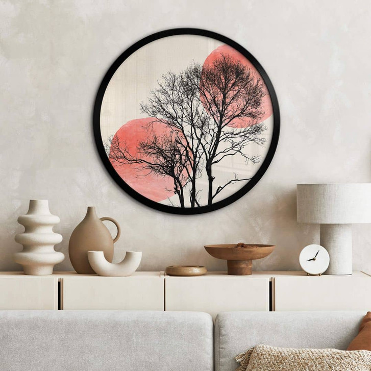 Das Rundbild des Kunstprojekts Kubistika widmet sich den Themen Natur, Wald & Bäume sowie Kunst und schafft mit einfachen Mitteln eine beruhigende Atmosphäre. Getreu dem Motto „Weniger ist mehr“ wird hier Raum für das Wesentliche geschaffen. Während der kahle Baum den Winter symbolisiert, strahlen Sonne und Mond wohlige Wärme und Behaglichkeit aus. Das kreisrunde Naturmotiv fügt sich problemlos in viele Räume ein, und auch am Arbeitsplatz sorgt der Kunstdruck für eine beruhigende Atmosphäre.