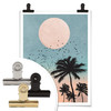 Diese paradiesische Illustration zeigt einen harmonischen Farbübergang bei Sonnenuntergang. Die Palmen lassen auf einen nahegelegenen Strand schliessen und verleihen dem Motiv einen exotischen Flair. Der Tag neigt sich dem Ende zu und ein Vogelschwarm fliegt in der idyllischen Landschaft umher.
