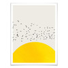 Die Sonne glüht wie eine goldene, heisse Kugel am Horizont, während ein Vogelschwarm in der Ferne die Luft absucht.
