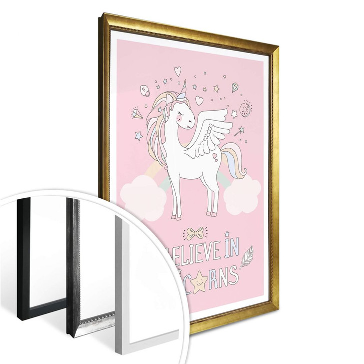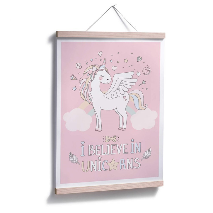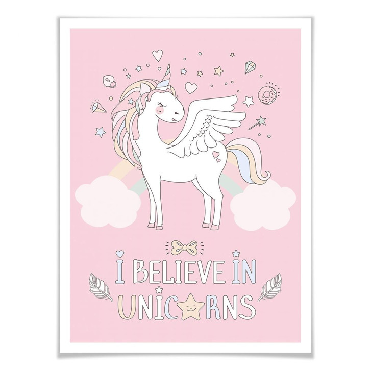 Lass deine Kinder mit diesem bezaubernden Einhornmotiv in eine fantasievolle Welt eintauchen! Dieses Poster zaubert einen Hingucker in Pink und lässt jedes Mädchen dahinschmelzen. Mit der Aufschrift „Ich glaube an Einhörner“ und dem majestätisch posierenden Einhorn im Vordergrund wird jedes Zimmer im Handumdrehen wie eine Märchenwelt aussehen. Wenn deine Kinder leidenschaftliche Einhornliebhaber sind, warum dekorierst du dann nicht ihre Zimmer in Pastelltönen? Wir haben verschiedene Motive mit Einhörnern in unserem Shop, die du perfekt kombinieren kannst!