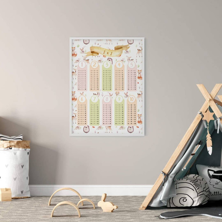 Das Kinderzimmer ist oft der Ort, an dem unsere Sprösslinge schlafen, spielen und lernen. Umso wichtiger ist eine kindgerechte Einrichtung. Dieses Poster mit Tierillustrationen der Künstlerin Kristina Kvilis ist für viele Zwecke geeignet. Dieses liebevoll gestaltete Lernposter verbindet Lernen mit Spiel und Spass auf wunderbare Weise. Im Vordergrund ist das kleine 1 x 1 zu sehen. Den Hintergrund zieren zahlreiche Waldtiere: Füchse, Igel, Rehe und Vögel.