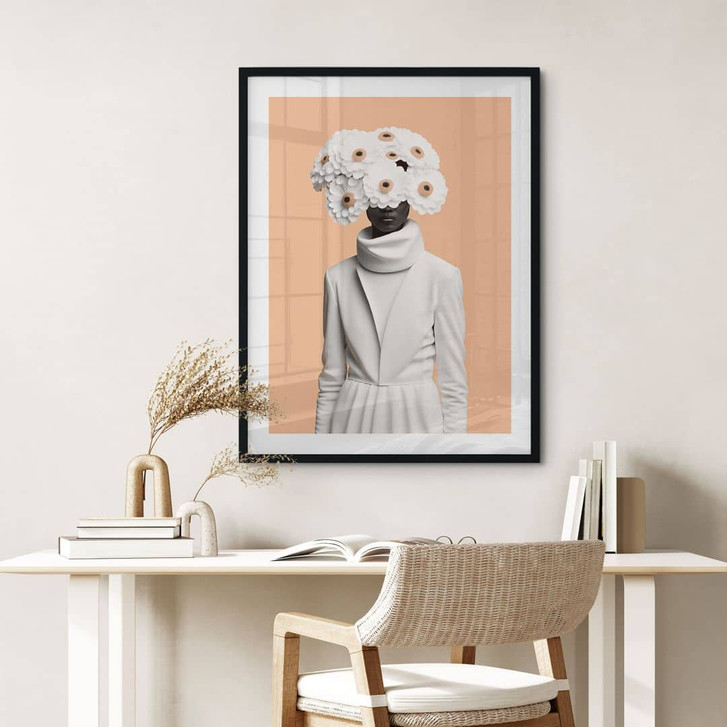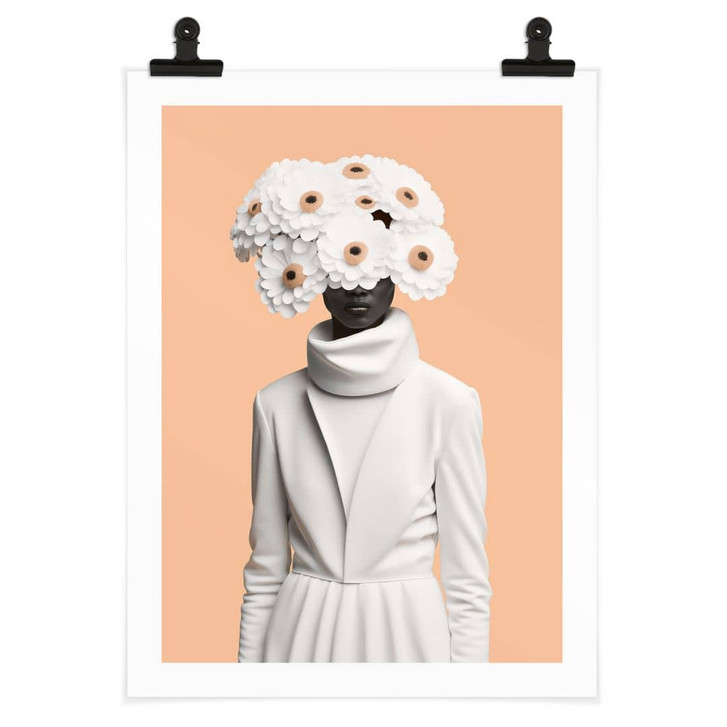 Möchtest du deine Wände geschmackvoll dekorieren, ohne zu übertreiben? Unser abstraktes Bild hilft dir, den richtigen Look für deine Räume zu finden. Der Treechild-Kunstdruck ist ein echter Hingucker an der Wand! Eine Frau in schicker weisser Kleidung trägt einen auffälligen Blumenkopfschmuck. Das Weiss bildet einen schönen Kontrast zur pfirsichfarbenen Hintergrundfarbe.