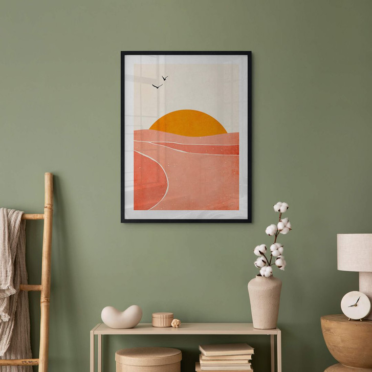 Schaffe mit dieser Wanddekoration ein aufregendes Wohnerlebnis und verleihe deinen Wänden den perfekten Look. Die Abbildung einer Landschaft bei Sonnenaufgang ist in leuchtenden Farben und voller Kontraste dargestellt. Das Motiv wurde von Kubistika geschaffen und ist eine Hommage an die wunderbare Natur. Mit nur wenigen Mitteln hat er ein modernes Gemälde geschaffen, das für maximale Behaglichkeit sorgt. Auf Überflüssiges wurde hier bewusst verzichtet. Lass dich von dem Bild in eine idyllische Landschaft entführen! Das Hochformat des Posters besticht durch einen erstklassigen Druck, der die rote Farbgebung stilvoll zur Geltung bringt. Es lässt sich leicht an deine Wände pinnen, kleben oder rahmen. Mit nur wenig Aufwand schaffst du dir ein faszinierendes Raumgefühl.