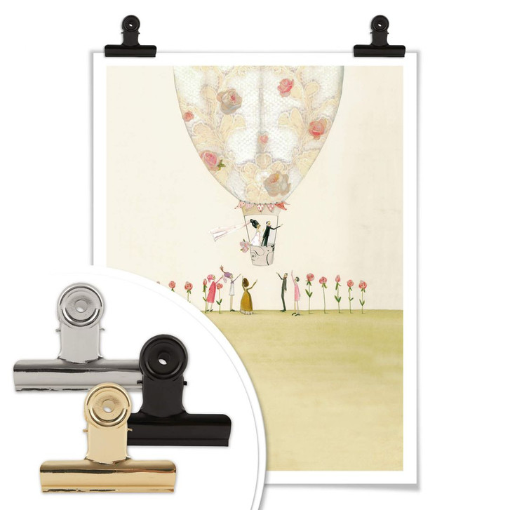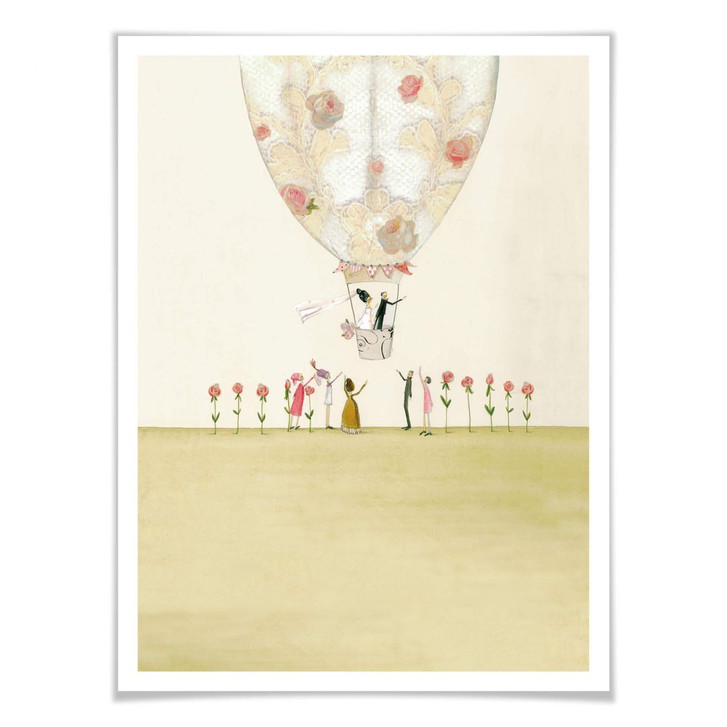 Schmückt eure leere Wand mit der liebevollen Illustration „Hochzeitsballon“ der Künstlerin Silke Leffler. Die Hochzeitsgäste verabschieden sich nach der Trauung von Braut und Bräutigam. Das Brautpaar fliegt in einem romantischen Heissluftballon in Richtung Zukunft. Das Poster ist in verschiedenen Grössen erhältlich.