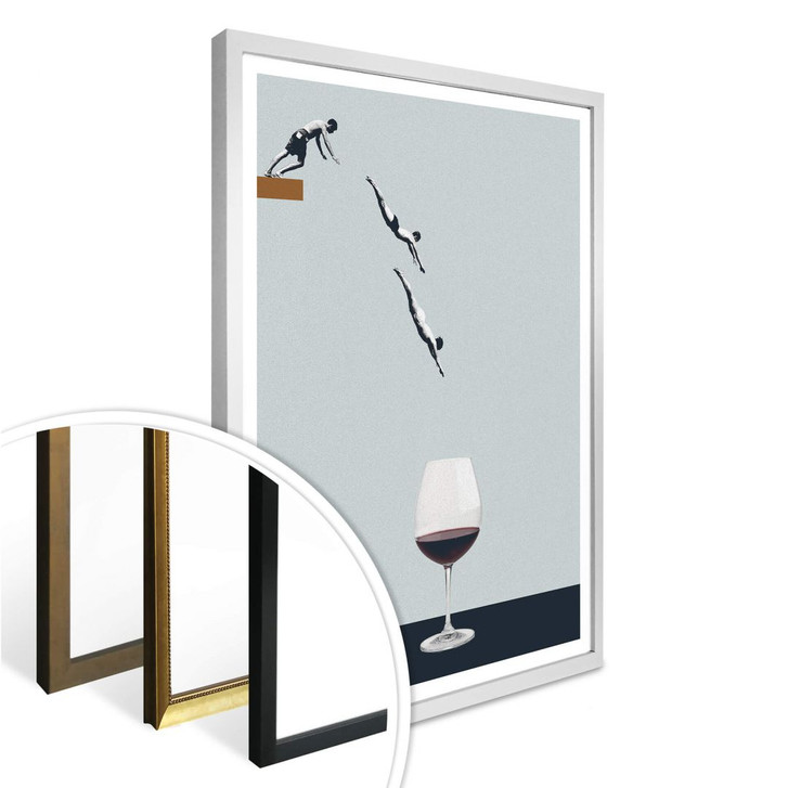 Dieses aussergewöhnliche Motiv zeigt drei Menschen, die kopfüber von einer Plattform in ein volles Weinglas springen. Das Bild selbst ist in zurückhaltenden Farben wie Grau und Schwarz gestaltet. Mit der dazugehörigen Bildunterschrift symbolisiert die Illustration das Altern in einer Gruppe. Das Wandbild ist eine lustige Anekdote über das Älterwerden mit Freunden.