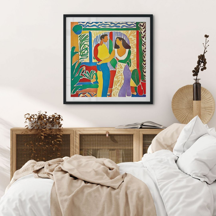 Zuhause ist ein Ort, an dem sich Familie und Gäste wohlfühlen sollen. Dieses Poster verleiht der Umgebung eine angenehme Atmosphäre. Der Kunstdruck von Zamart zeigt ein Paar in einem Raum. Das Paar strahlt Zusammengehörigkeit, Intimität und starke Bindungen aus. Das farbenfrohe Motiv wurde im Stil des bedeutenden Künstlers der klassischen Moderne Henri Matisse gemalt. Hier wurden Formen, Linien und ausdrucksstarke Farben eingesetzt, um eine starke Wirkung zu erzielen. Das abstrakte Bild kann das Raumgefühl positiv beeinflussen.