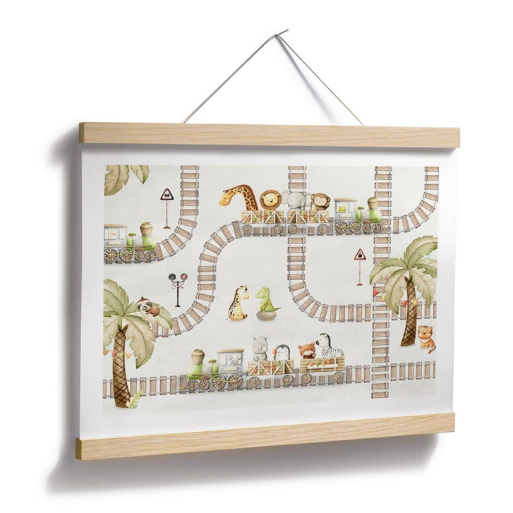 Schöne, fröhliche Motive verleihen jedem Kinderzimmer den letzten Schliff. Mit diesem Wandbild können die Kleinen in eine fantasievolle Welt eintauchen. Das Poster ist ein Blickfang in jedem Baby- oder Kinderzimmer. Die liebevolle Illustration von Oliver Robins zeigt lustige Tiere, die mit der Lokomotive durch den Zoo fahren. Entdeckt mit euren Kindern die verschiedenen Schienenstrecken und die Tiere in den offenen Waggons. Giraffe, Elefant, Nilpferd, Pinguin oder Zebra – welches ist der Favorit eures Kindes?