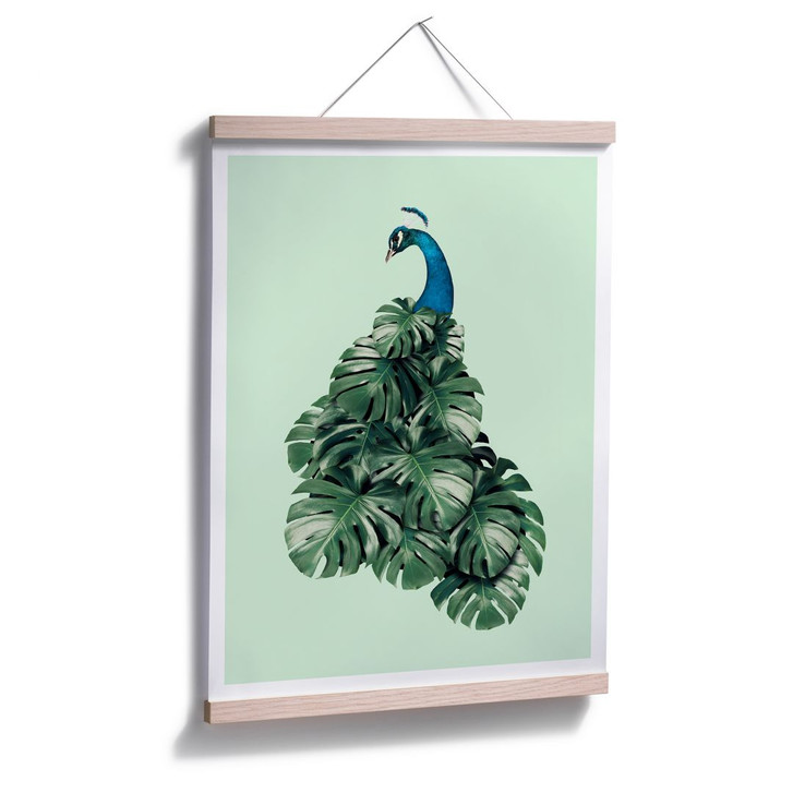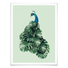 Ein Pfau präsentiert sich mit seinen bunten Federn immer elegant und majestätisch. Auch hier präsentiert sich der Vogel mit einer stolzen Haltung und ist mit tropischen Monsterblättern geschmückt. Das Tiermotiv in Grün wirkt natürlich und ist ein Blickfang im Flur, Schlafzimmer oder Wohnzimmer.