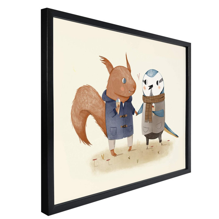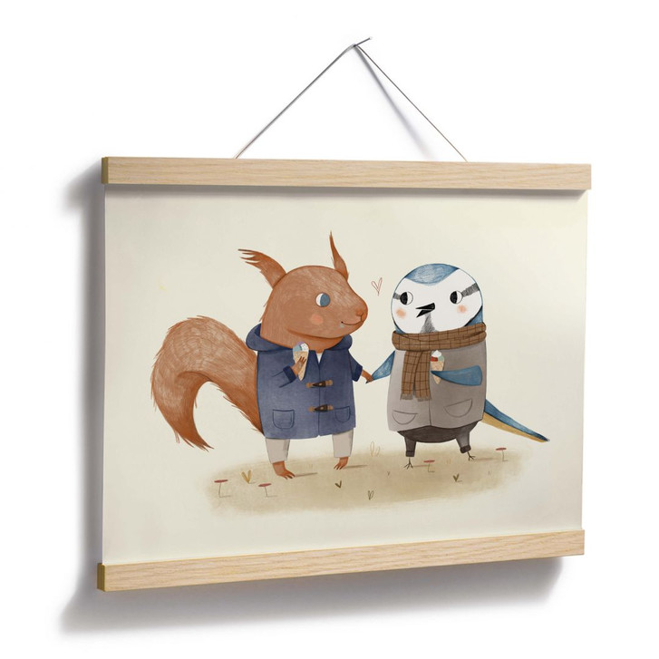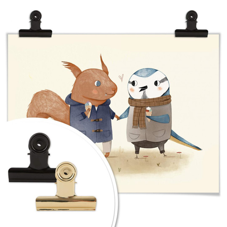 Jedes Kind ist besonders und einzigartig. Umso wichtiger ist es, sein Zimmer individuell zu gestalten. Die Welt der Kleinen ist bunt, fantasievoll und vielfältig – mit dieser Wanddekoration holst du dir ein Stück Kreativität an die Wand. Die Illustration der Künstlerin Judith Loske schafft einen tierischen Hingucker im Kinderzimmer. Das Poster zeigt ein Eichhörnchen und eine Meise, die sich liebevoll an den Händen halten. Trotz dicker Wintermäntel und Schals geniessen sie jeweils eine Eistüte.