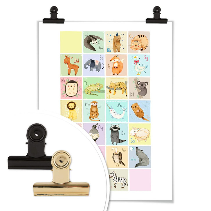 Unsere Auswahl an Kinderzimmerdekorationen ist vielfältig und bietet jedem Kind eine einzigartige Inneneinrichtung in einer Vielzahl von Farben, Formen und Materialien. Mit kindgerechten Dekorationselementen wird die Fantasie der Kleinen angeregt und die Kreativität gefördert. Diese Illustration von Judith Loske ist eine niedliche Dekorationsidee für das Kinderzimmer. Das hochwertige Poster zeigt das englische Alphabet mit dem passenden Tier: von A wie Ameisenbär über K wie Koala bis Z wie Zebra.