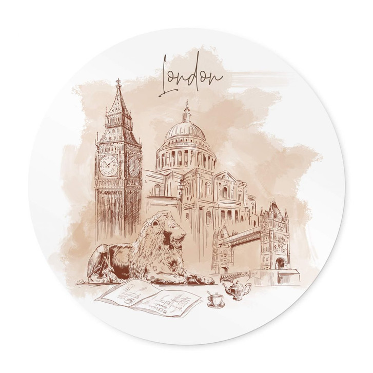Mache mehr aus deinem Zuhause und ziehe mit diesem wunderbaren Wandaccessoire die Aufmerksamkeit auf deine Wand! Der Künstler zeigt die Wahrzeichen Londons: Big Ben, Tower Bridge, St. Paul's Cathedral, den Löwen auf dem Trafalgar Square sowie eine Teekanne und eine Teetasse.