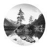 Dieses runde Poster bringt die unvergleichliche Schönheit einer malerischen Berglandschaft direkt in dein Zuhause. Im Zentrum der Szene befindet sich ein ruhiger Bergsee, dessen kristallklare Oberfläche die umliegende Natur perfekt widerspiegelt. Ein Felsen, aus dem zwei markante Bäume wachsen, erhebt sich majestätisch aus dem Wasser und zieht den Betrachter sofort in seinen Bann. Im Hintergrund ragen die Berggipfel in den Himmel, eingehüllt in eine mystische Atmosphäre, die Ruhe und Gelassenheit ausstrahlt.
