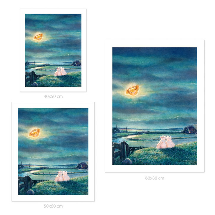 Ein verliebtes Schweinepaar sitzt auf der Wiese und geniesst den hellen Schweinemond. Der Kunstdruck von Wolf-Rüdiger Marunde verbindet die Themen Romantik und Liebe mit Landschaften und bringt einen Hauch ländlicher Idylle an Ihre Wände.