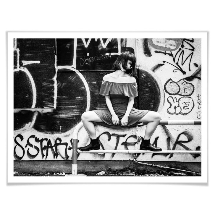 Das Foto zeigt eine junge Frau, die vor einer Wand mit Graffiti posiert. Das Bild spiegelt die junge, moderne und verspielte Jugend sowie die bekannte Strassenszene von Shibuya wider. Hol dir den Lifestyle von Tokio nach Hause und dekoriere stilvoll mit Schwarz-Weiss-Fotografien von Matsunaga!
