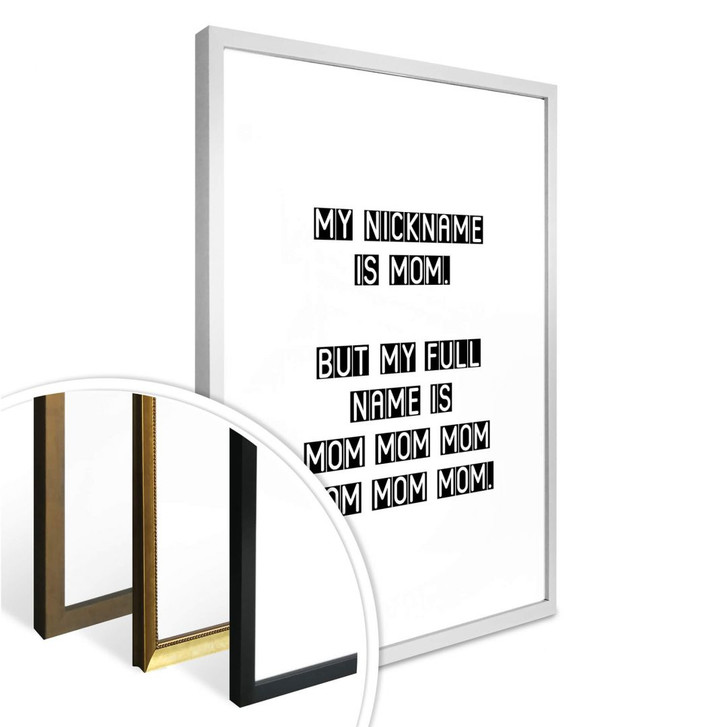 Das weisse Poster mit der schwarzen Aufschrift „My Nickname is Mom. But my full name is Mom Mom Mom Mom Mom Mom.“ ist ein Hingucker an der Wand. Der Spruch ist als Poster in verschiedenen Grössen erhältlich. Die Wandhalterung kannst du gleich mitbestellen!