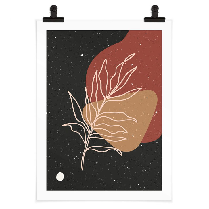 Verschönere dein Zuhause. trenddeko.ch bietet Wandkunst für jeden Geschmack. NKTN erstellt hier einen farbenfrohen Kunstdruck. Im Mittelpunkt steht ein zarter Zweig mit kleinen Blättern. Der schwarz-braune Hintergrund bildet einen schönen Kontrast.