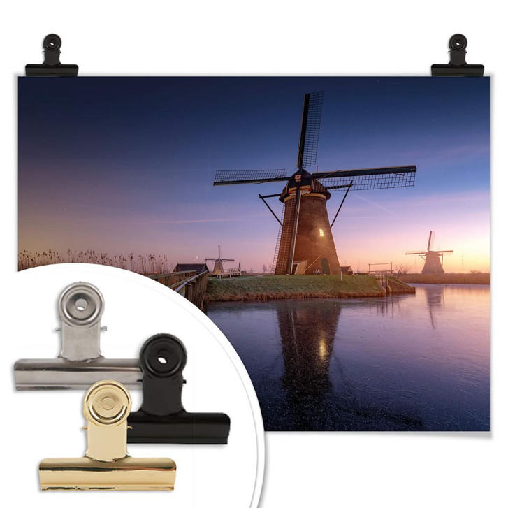 Dieses romantische Bild des Künstlers Pablo lädt zum Träumen ein. Die kleine Holzbrücke führt zu den gut erhaltenen Windmühlen, die in der Abenddämmerung im Mittelpunkt stehen. Mit diesem Motiv entführen wir dich in eine idyllische und friedliche Gegend, in der du die violetten Wolken vorbeiziehen sehen kannst.