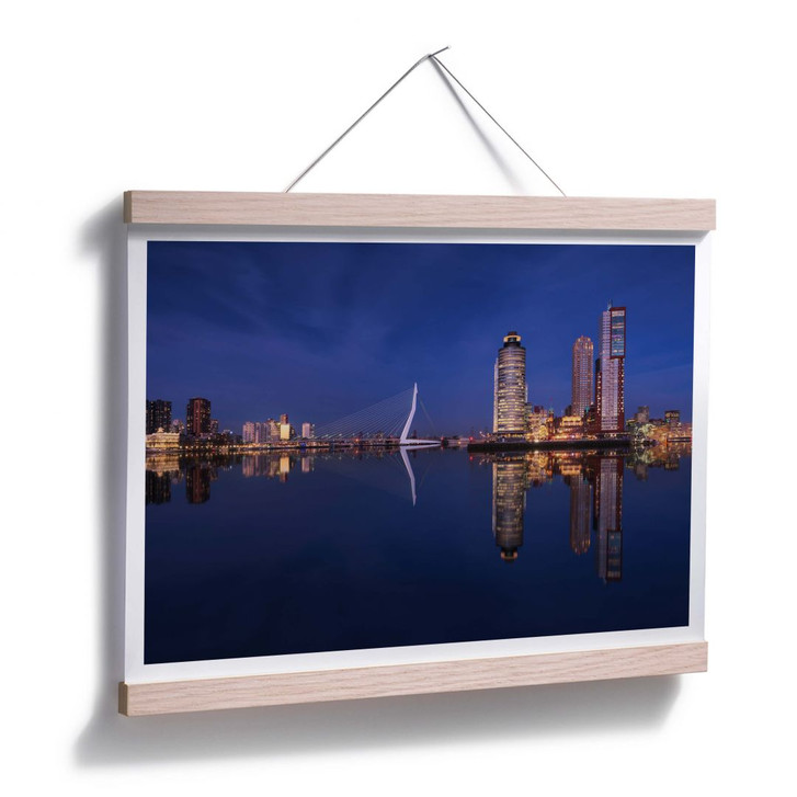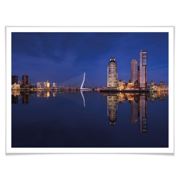 Eine wunderbare Nachtansicht der hell erleuchteten Skyline von Rotterdam. Rotterdam ist die zweitgrösste Stadt der Niederlande. Das Foto wurde am Fluss Maas aufgenommen und zeigt unter anderem die Erasmusbrücke. Diese beeindruckende Brücke verbindet seit 1996 das Zentrum von Rotterdam mit dem „Kop van Zuid“. Auf dem Bild ist auch das Hotel New York zu sehen, vor dem zwei Wolkenkratzer stehen. Das Erstaunlichste an diesem Foto ist wahrscheinlich, dass die Maas völlig ruhig ist und sich die Gebäude wunderbar darin spiegeln können.