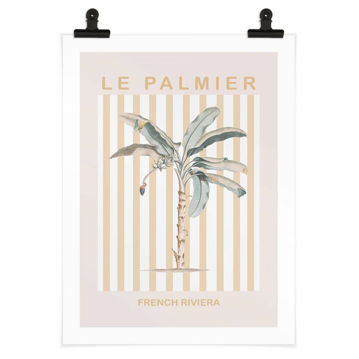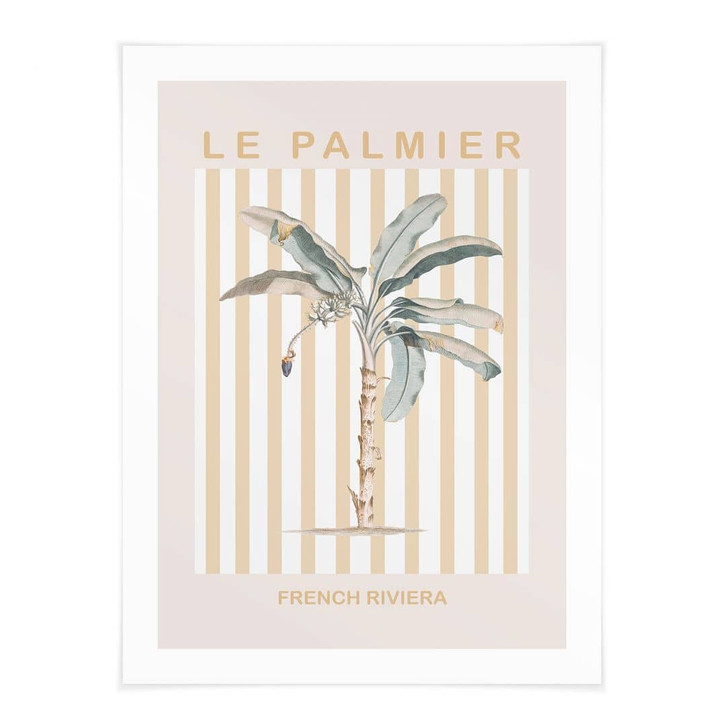 Diese Illustration bringt Urlaubsstimmung direkt an deine Wände: Eine grosse Palme steht im Mittelpunkt des Bildes – das Wahrzeichen der Côte d'Azur. Die gelb-weissen Streifen im Hintergrund betonen zusätzlich die französische Leichtigkeit und Lebensfreude.