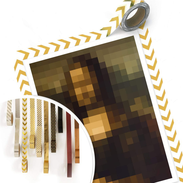 Wir interpretieren alte Meister neu! Das berühmte Kunstwerk „Mona Lisa“ von Leonardo da Vinci wird in einem neuen Design mit vielen kleinen Pixeln in bräunlichen Farbtönen neu gestaltet.