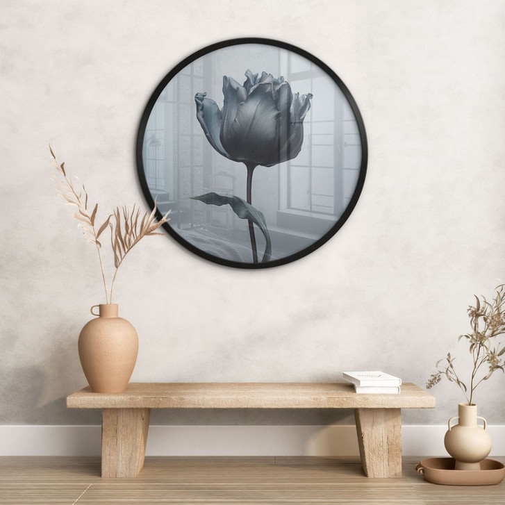 Dieses runde Poster von Bilge Paksoylu zeigt eine Tulpe in samtigen, dunklen Tönen. Die harmonische runde Form verstärkt die Eleganz und Ruhe, die das Motiv ausstrahlt, und verleiht dem Bild eine einzigartige Präsenz. Die feinen Details der Blütenblätter und die sanften Grautöne passen perfekt in eine minimalistische und moderne Umgebung.