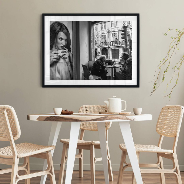 Lass dich von unseren vielfältigen Motiven für einen modernen Look inspirieren! Der Schwarz-Weiss-Kunstdruck von Luis Sarmento zeigt ein älteres italienisches Paar, das in einem Café sitzt und sich bei einer Tasse Kaffee unterhält. Sie werden von einer Frau auf einem Werbeplakat beobachtet.