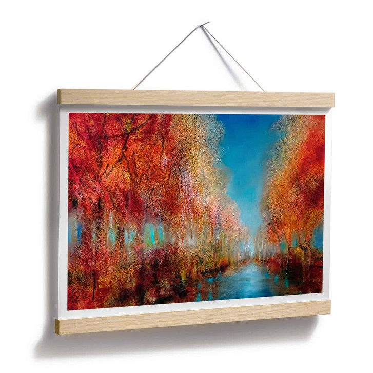 Warum nicht eine kleine Auszeit nehmen und dem Stress entfliehen? Nirgendwo gelingt das besser als in den eigenen vier Wänden. Der Kunstdruck der Malerin Annette Schmucker entführt in eine zauberhafte Landschaft. Auf dem nordamerikanischen Kontinent ist dieses Phänomen auch als Indian Summer bekannt – es ist Spätherbst, die Temperaturen sind angenehm und die Blätter der Bäume leuchten in beeindruckenden Farben. Das Farbspektrum reicht von Grün über Gelb, Orange und Rot bis hin zu Braun.