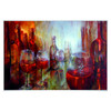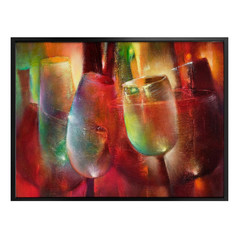 Das stimmungsvolle Motiv der zeitgenössischen Künstlerin Annette Schmucker zeigt Weingläser und Weinflaschen in ausdrucksstarken und wirkungsvollen Rottönen.