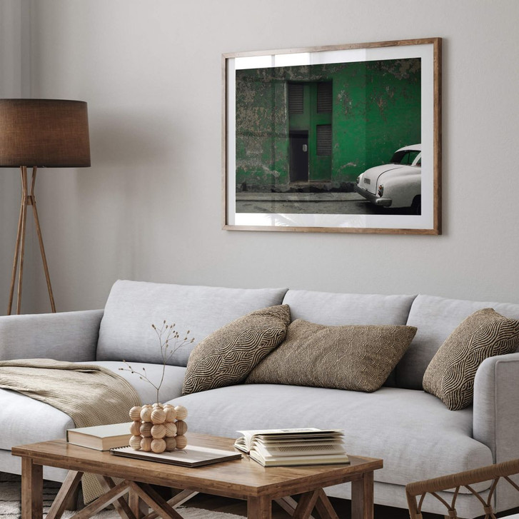 Zuhause ist der Ort, an dem man am besten entspannen kann. Umso wichtiger ist eine stimmige Umgebung, die zum Wohlfühlen einlädt. Die Vintage-Fotokunst der Fotografin Inge Schuster zeigt ein Stück der Karibikinsel Kuba. Das grün gestrichene Haus bröckelt langsam vor sich hin. Auf der Strasse ist ein Teil eines weissen Autos zu sehen.