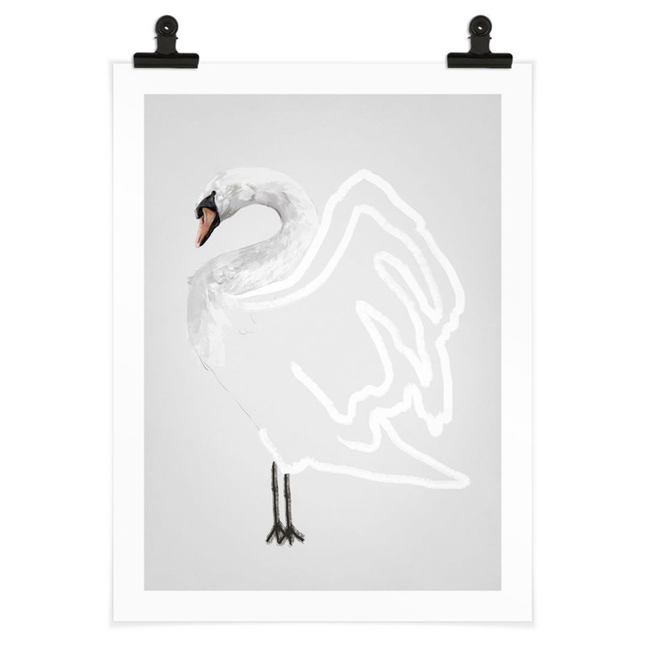 Möchtest du deiner Inneneinrichtung einen besonderen Charakter verleihen? Unser Poster verleiht deiner Wand einen modernen Touch. Kein Vogel ist so elegant schön wie der Schwan. Er symbolisiert Liebe und Reinheit und wirkt mit seinen weissen Federn und grossen Flügeln magisch auf uns Menschen. Mit diesem Gemälde zeigt die Künstlerin Gabriella Roberg die schlichte Schönheit des faszinierenden Schwans. Das Motiv besteht aus einer Mischung aus realistischen und abstrakten Elementen, die teilweise surreal wirken.