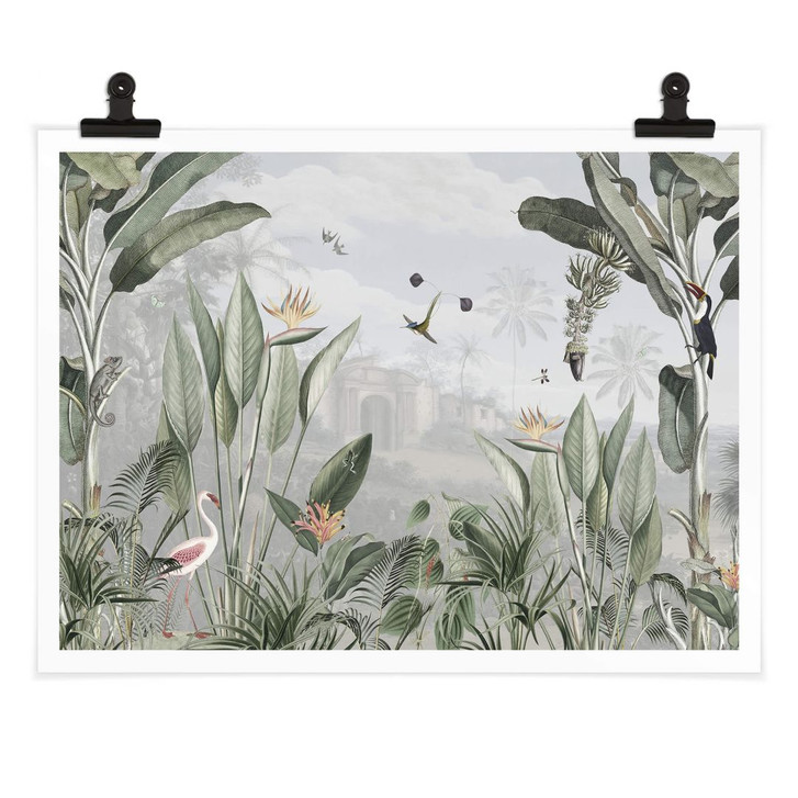 Der grüne, lebendige Wald beherbergt eine grosse Vielfalt an Flora und Fauna. Hohe Palmen, üppige Bäume und wilde Tiere fangen das Bild der Natur perfekt ein. Liebevoll gestaltet mit viel Liebe zum Detail und besonders für Kinder geeignet, besticht das Dschungelmotiv durch kleine Details und harmonisch aufeinander abgestimmte Farben. Es versetzt einen direkt in eine beruhigende Umgebung, in der man sich wunderbar entspannen kann. Wer spannende Wände im Wohnzimmer, Kinderzimmer oder am Arbeitsplatz schaffen möchte, ist mit diesem Poster genau richtig beraten.