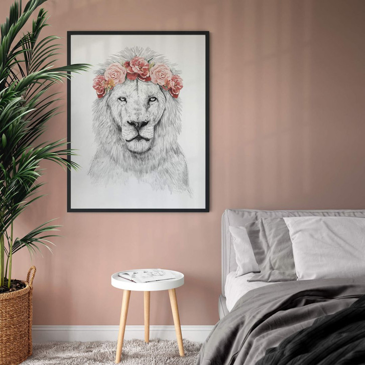 Eine harmonische Wandgestaltung ist wichtig für das Wohlbefinden in den eigenen vier Wänden. Weisse Wände wirken oft kahl und langweilig. Mit unserer Auswahl an Bildern und Deko-Elementen kann man sich kreativ austoben. Der Kunstdruck des ungarischen Illustrators Balazs Solti eignet sich perfekt dafür. Das Poster zeigt ein schwarz-weisses Porträt eines Löwen. Er trägt einen roten Blumenkranz im Haar, was ihn sommer- und festtauglich macht!