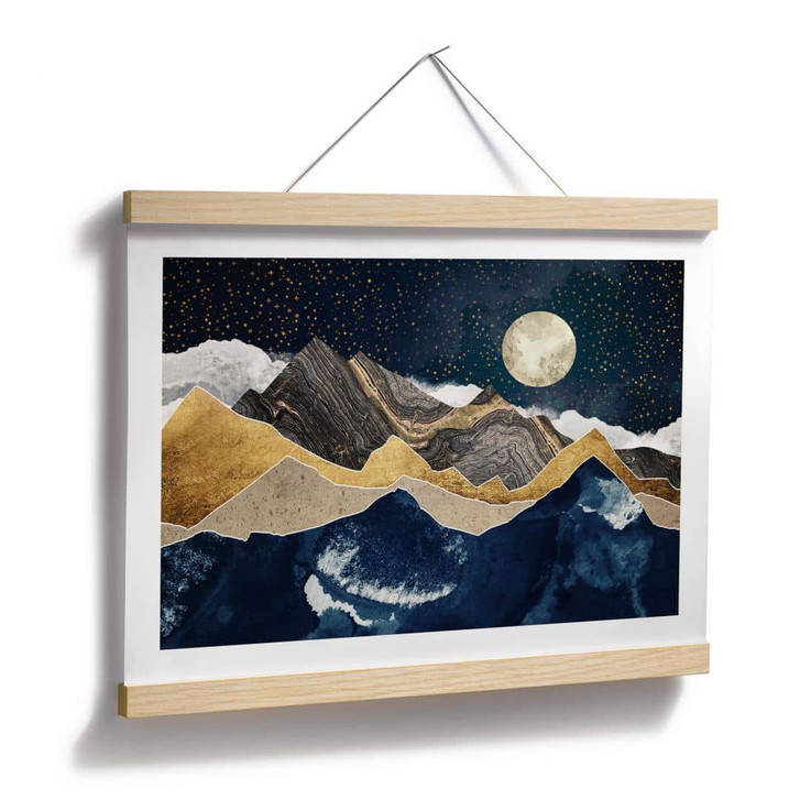 Entdecke bei trenddeko.ch die perfekte Dekoration für ein stilvolles Zuhause! Dieses Motiv verschönert kunstvoll die kahle Wand. Wenn du dich nach Natur, Landschaften und Bergen sehnst, ist der Kunstdruck von SpaceFrog Designs perfekt für dich. Dieses Landschaftsmotiv zeigt eine Bergkette in verschiedenen Erdtönen. Durch den Hell-Dunkel-Kontrast ist jeder Berg deutlich zu erkennen. Ausserdem betonen die dunkelblauen Farben die nächtliche Stimmung und Umgebung wunderbar. Lass dich vom Vollmond und den Sternen in eine romantische Berglandschaft entführen!