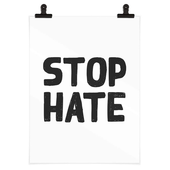 Stilvoll und aussagekräftig: Das Slogan-Poster „Stop Hate“ richtet sich gegen Krieg, Online-Hass, Rassenhass und weitere Diskriminierung von Andersdenkenden.