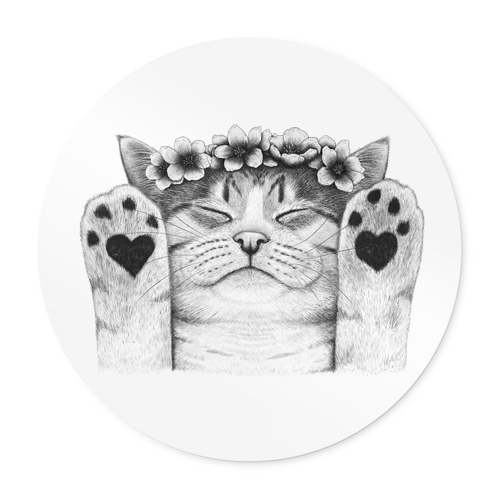 Diese liebevolle Schwarz-Weiss-Zeichnung der Künstlerin Valeriya Korenkova bringt pure Freude in Ihr Zuhause. Die entspannte Katze mit geschlossenen Augen und erhobenen Pfoten strahlt ein Gefühl von Geborgenheit und Wohlbefinden aus. Besonders charmant sind die herzförmigen Muster auf den Pfoten und der zarte Blumenkranz, die dem Motiv eine sanfte, romantische Note verleihen.