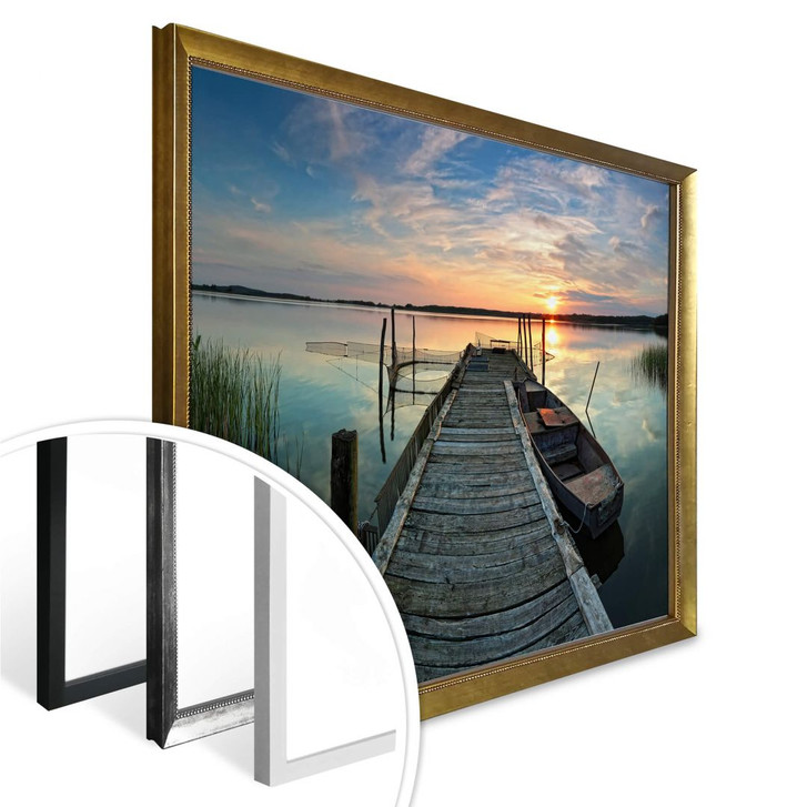 Ruhe, Entspannung, Frieden – all diese Gefühle werden beim Anblick dieses Sonnenuntergangs in unserem Geist und Körper geweckt. „Sonnenuntergang am See“ ist ein bezauberndes Motiv, das an einem magischen Ort aufgenommen wurde. Der Blick fällt auf einen idyllischen See, der durch den Sonnenuntergang im Hintergrund in ein besonderes Licht getaucht wird. Die Wolken spiegeln sich in einer faszinierenden Anordnung im Wasser. Bei diesem Anblick möchte man am Steg entlang spazieren, um sich am Ende fallen zu lassen und die Füsse im Wasser baumeln zu lassen. Das Boot lädt zu einer romantischen Tour im Sonnenuntergang ein. Das Motiv regt zu einer kleinen Fantasiereise an. Im Schlafzimmer platziert, verhilft es sicherlich zu angenehmen Träumen. Aber auch in jedem anderen Raum deines Zuhauses wird durch den wunderschönen Sonnenuntergang über dem See eine gemütliche Atmosphäre geschaffen.