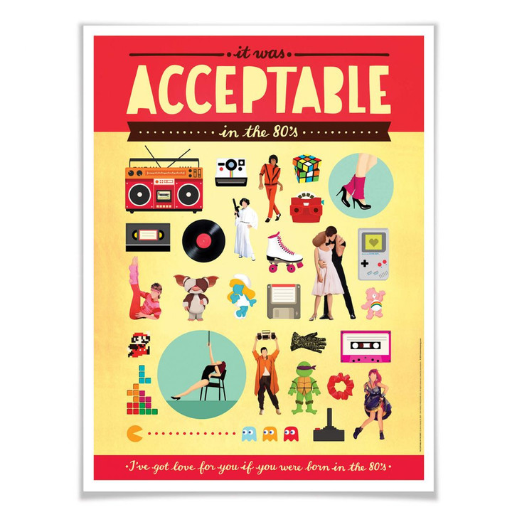 Erinnerst du dich an die aufregenden 80er Jahre? In diesem Jahrzehnt entstanden Objekte mit Kultstatus: Gameboy, Zauberwürfel, Tetris und Stulpen. Aber auch beliebte Filme wie „Dirty Dancing“ und „Star Wars“ waren sehr beliebt. Das plakative Motiv zeigt einige dieser nostalgischen Dinge, an die wir uns gerne erinnern. Dekoriere im trendigen Retro-Look mit dem farbenfrohen Kunstdruck von Tohmé!