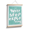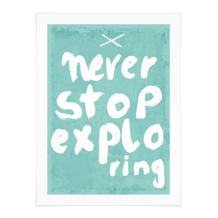 Verschönere dein Zuhause mit raffinierten Bildern und schaffe einen inspirierenden Ort! Der Kunstdruck von Treechild zeigt den weissen Schriftzug „Never stop exploring“ auf blauem Hintergrund.