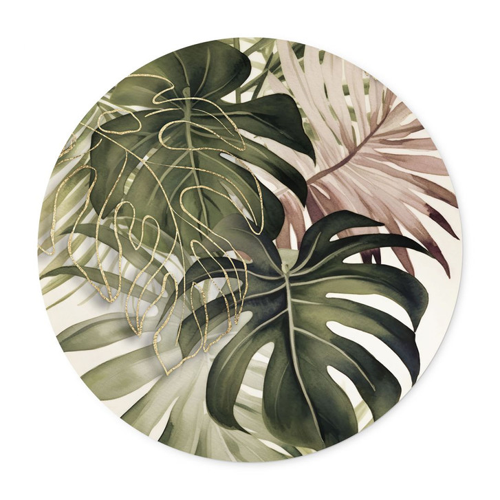 Dieses runde Poster bringt die sanfte Eleganz tropischer Blätter direkt in dein Zuhause und verleiht deinen Wänden einen besonderen Hauch von Exotik und Stil. Die meisterhaft gestalteten Monstera- und Palmblätter in satten Grüntönen, ergänzt durch zarte goldene Akzente, schaffen eine Atmosphäre von Harmonie und Luxus. Jedes Detail dieses Kunstwerks wurde sorgfältig ausgearbeitet, um die Schönheit und Ruhe der Natur auf zeitlose Weise einzufangen.