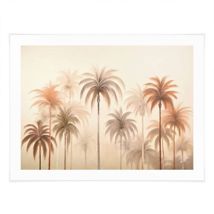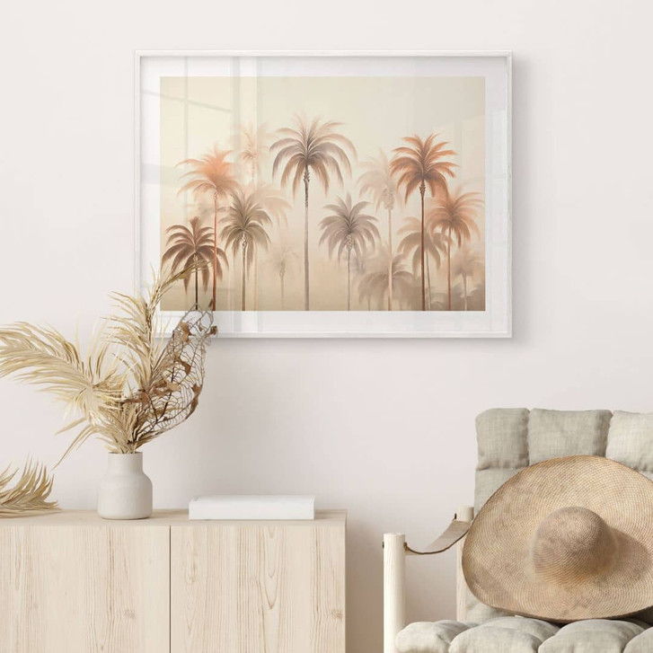 Dieses Poster fängt die sanfte Eleganz einer tropischen Palmenlandschaft ein und verwandelt deine Wände in eine Oase der Ruhe. Die warmen, erdigen Töne, von sanften Brauntönen bis hin zu warmen Orangetönen, schaffen eine beruhigende und entspannende Atmosphäre. Die Palmen, eingehüllt in Nebel, ragen majestätisch in den Himmel und bringen ein Stück tropische Natur direkt in dein Zuhause.
