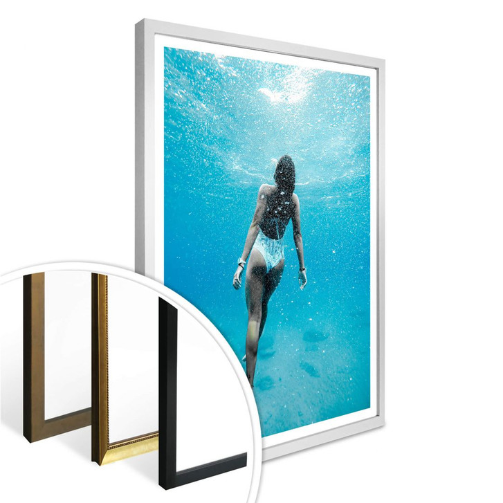Das Foto einer Frau unter Wasser setzt tolle Akzente – auf Wunsch können Sie auch passende Washi-Tapes, Bilder- oder Posterleisten zur Befestigung bestellen.