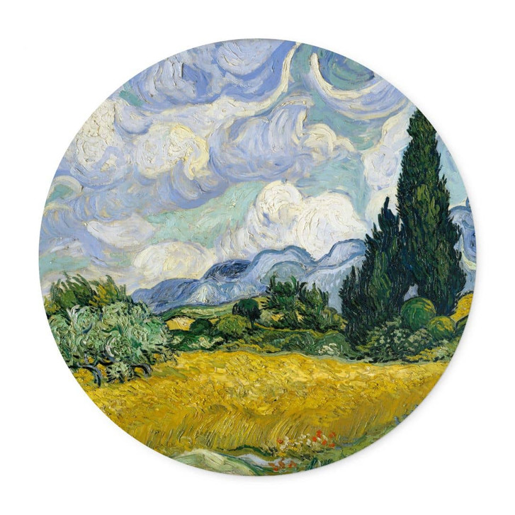 Wenn du ein Fan der alten Meister bist, ist dieses Landschaftsgemälde von Vincent van Gogh genau das Richtige für dich. Der Kunstdruck zeigt robuste Zypressen, ein Weizenfeld wie ein Meer aus Gold und Wolken, die sich dramatisch am Himmel auftürmen. Eine wilde und wunderschöne Idylle als rundes Poster bringt frischen Wind in dein Zuhause.