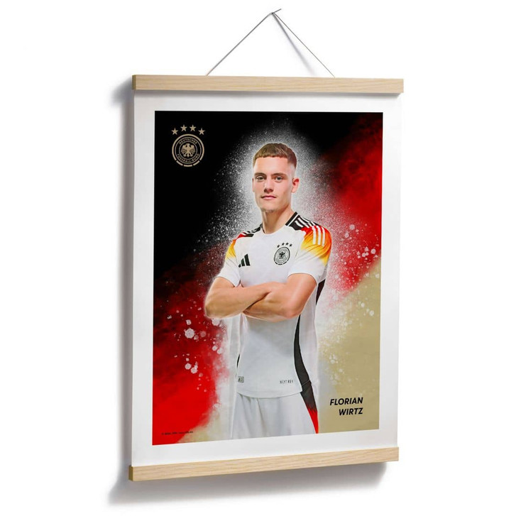 Florian Wirtz wird bei der Europameisterschaft 2024 in Deutschland als starker Offensiv-Mittelstürmer dabei sein. Er trägt das offizielle DFB-Trikot in Weiss und in den Farben Schwarz, Rot und Gold. Natürlich darf auch das DFB-Logo mit den vier Weltmeistersternen nicht fehlen. Hol dir den Fussballprofi als Poster für dein Zuhause und schaffe eine einzigartige Fussballatmosphäre in deinen eigenen vier Wänden!