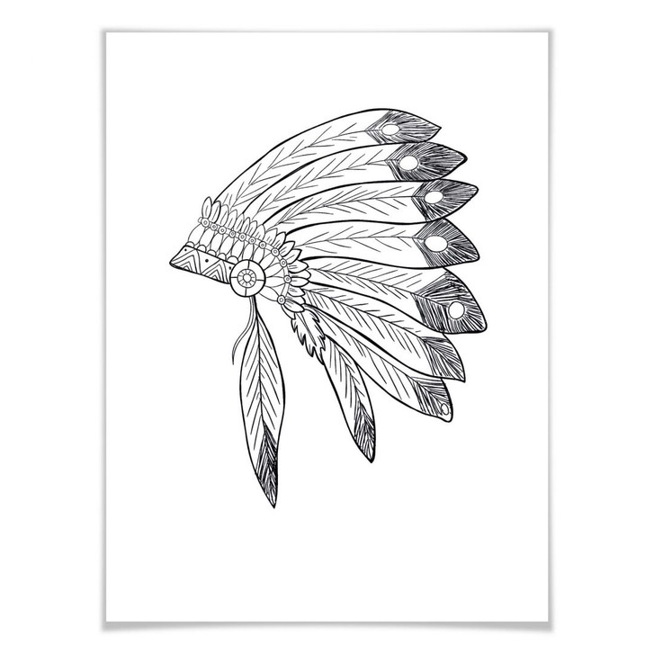 Schmücke deine Wand mit dem Motiv „Kriegsbonnet“. Das schwarz-weisse Poster zeigt eine Kriegsbonnet der nordamerikanischen Indianer. Diese war eine Auszeichnung für Krieger, die sich im Krieg durch ihre Tapferkeit hervorgetan haben. Die Anzahl der Federn zeigt die Anzahl der siegreichen Schlachten an.