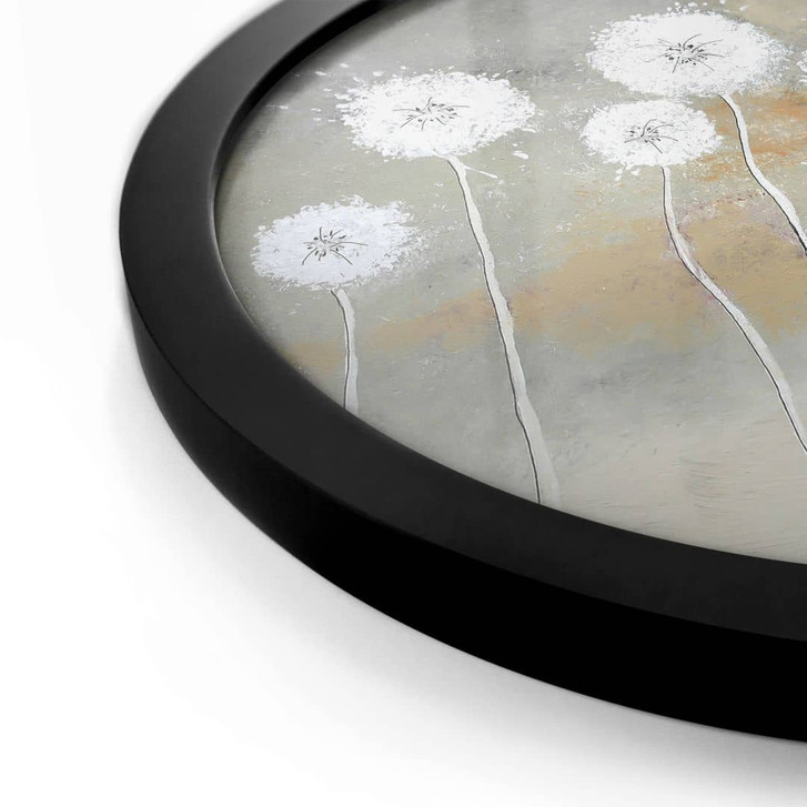 Blumen machen bekanntlich glücklich. Und diese Löwenzahnblüten als rundes Poster bereiten dauerhaft Freude. Dieser Blumenkunstdruck stammt von der Malerin Tina Melz und zeigt wundersame Löwenzahnblüten aus der Natur. Der graue Hintergrund wurde hier abstrakt dargestellt, während sich die weissen, schneeballartigen Blüten in einer konkreten Kunstform präsentieren. Durch das neutrale Design eignet sich das Wandbild für viele Räume, wie Flure, Küchen, Wohnzimmer und Büros.
